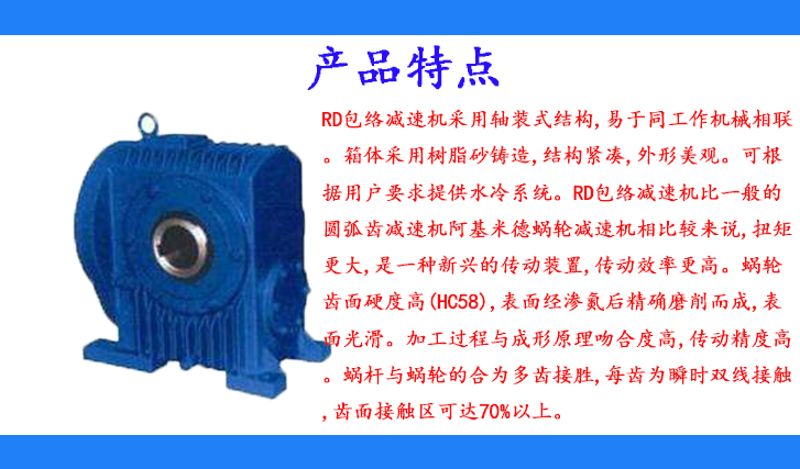 RD包絡(luò)減速機(jī)采用軸裝式結(jié)構(gòu),易于同工作機(jī)械相聯(lián)。箱體采用樹脂砂鑄造,結(jié)構(gòu)緊湊,外形美觀?筛鶕(jù)用戶要求提供水冷系統(tǒng)。RD包絡(luò)減速機(jī)比一般的圓弧齒減速機(jī)阿基米德蝸輪減速機(jī)相比較來說,扭矩更大,是一種新興的傳動裝置,傳動效率更高。蝸輪齒面硬度高(HC58),表面經(jīng)滲氮后精確磨削而成,離,面光滑。加工過程與成形原理吻合度高,傳動精度高。蝸桿與蝸輪的合為多齒接勝,每齒為瞬時雙線接觸,齒面接觸區(qū)可達(dá)70%以上!霎a(chǎn)品規(guī)格RD包絡(luò)減速機(jī)具體型號有RD-11-7.5,RD-11-10,RD-11-12.5,RD-4-240,RD-5.5-200,RD-5.5-280
