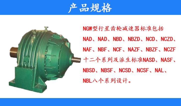 NGW型行星齒輪減速器標(biāo)準(zhǔn)包括NAD、NAD、NBD、NBZD、NCD、NCZD、NAF、NBF、NCF、NAZF、NBZF、NCZF十二個(gè)系列及派生標(biāo)準(zhǔn)NASD、NASF、NBSD、NBSF、NCSD、NCSF、NAL、NBL八個(gè)系列設(shè)計(jì)。
