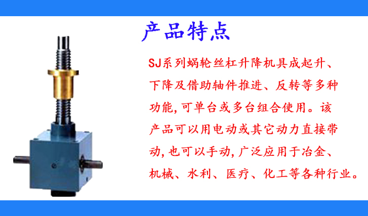 SJ系列蝸輪絲杠升降機具成起升、下降及借助軸件推進、反轉(zhuǎn)等多種功能,可單臺或多臺組合使用。該產(chǎn)品可以用電動或其它動力直接帶動,也可以手動,廣泛應(yīng)用于冶金、機械、水利、醫(yī)療、化工等各種行業(yè)。