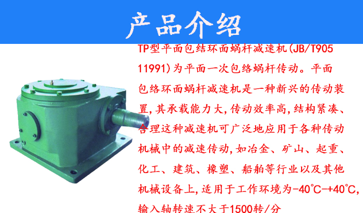 TP系列平面包絡(luò)環(huán)面蝸桿減速器(JBT9051-1999)為平面一次包絡(luò)蝸桿傳動,包括tpU、TPS、TPA三種形式,適用于冶金、礦山、起重、運輸、建筑、石油、化工、航天、航海設(shè)備或精密傳動的減速傳動。
