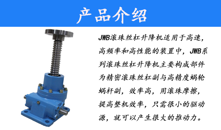 JWB滾珠絲杠升降機(jī)適用于高速、高頻率和高性能的裝置中,JWB系列滾珠絲杠升降機(jī)主要構(gòu)成部件為精密滾珠絲杠副與高精度度蝸輪蝸桿副,效率高,用滾珠摩擦,提高整機(jī)效率,只需很小的驅(qū)動(dòng)源,就可以產(chǎn)生很大的推動(dòng)力。