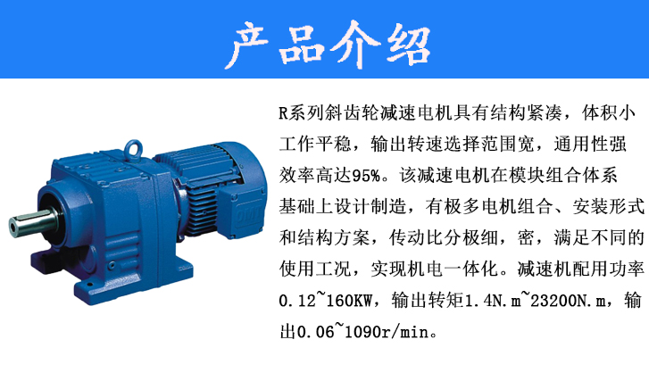■產(chǎn)品簡介R系列斜齒輪減速電機(jī)具有結(jié)構(gòu)緊湊、體積小、工作平穩(wěn)、輸出轉(zhuǎn)速選擇范圍寬,通用性強(qiáng),效率高達(dá)95%。該減速電機(jī)在模塊組合體系基礎(chǔ)上設(shè)計(jì)制造,有極多電機(jī)組合、安裝形式和結(jié)構(gòu)方案,傳動(dòng)比分級細(xì),密,滿足不同的使用工況,實(shí)現(xiàn)機(jī)電一體化。減速機(jī)配用功率0.12~10KW,輸出轉(zhuǎn)矩1.4n.m-23200nm,輸出0.06~1090r/min