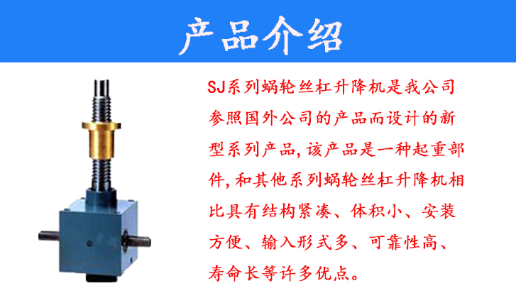 SJ系列蝸輪絲杠升降機(jī)是我公司參照國外公司的產(chǎn)品而設(shè)計的新型系列產(chǎn)品,該產(chǎn)品是一種起重部件,和其他系列蝸輪絲杠升降機(jī)相比具有結(jié)構(gòu)緊湊、體積小、安裝方便、輸入形式多、可靠性高、壽命長等許多優(yōu)點。
