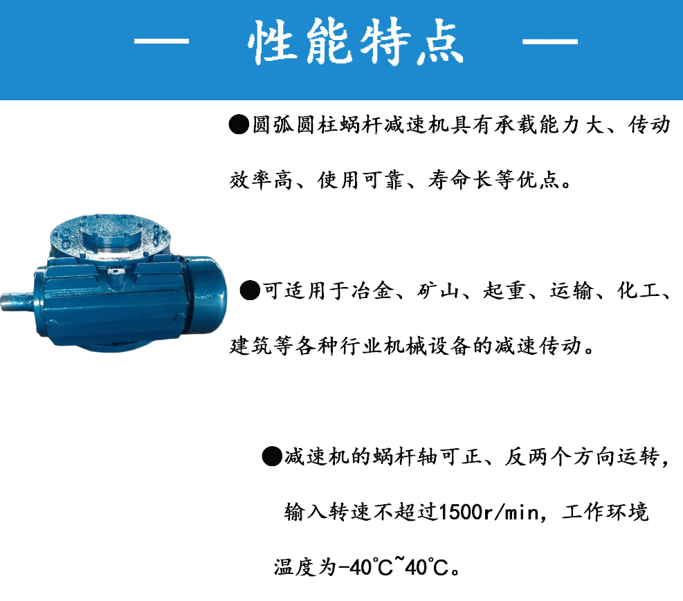 圓弧圓柱蝸桿減速機具有承載能力大、傳動效率高、使用可靠、壽命長等優(yōu)點,可適用于冶金、礦山、起重、運輸、化工、建筑等各種行業(yè)機械設備的減速傳動。減速機的蝸桿軸可正、反兩個方向運轉,輸入轉速不超過1500r/min,工作環(huán)境溫度為-40℃-40℃。