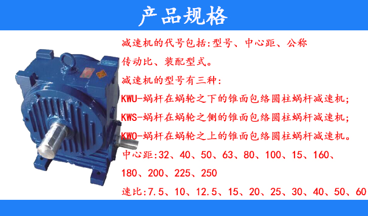 其中K-蝸桿為ZK1型,W一蝸桿減速速器,U-蝸桿在蝸輪之下,S-蝸桿在蝸輪之側,O-蝸桿在蝸輪之上。