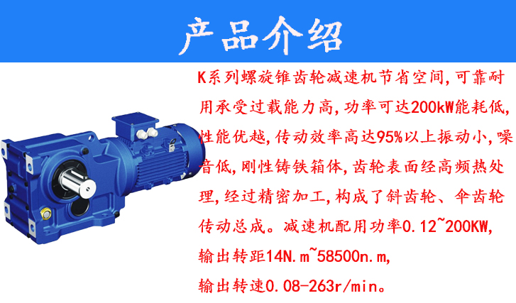 K系列螺旋錐齒輪減速機節(jié)省空間,可靠耐用承受過載能力高,功率可達200kW能耗低,性能優(yōu)越,傳動效率高達95%以上振動小,噪音低,剛性鑄鐵箱體,齒輪表面經(jīng)高頻熱處理,經(jīng)過精密加工,構成了斜齒輪、傘齒輪傳動總成。減速機配用功率0.12~200KW,輸出轉距14N.m~58500n.m,輸出轉速0.08-263r/min