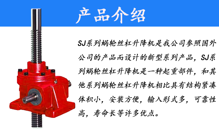 SJ系列蝸輪絲杠升降機具成起升、下降及借助軸件推進(jìn)、反轉(zhuǎn)等多種功能,可單臺或多臺組合使用。
