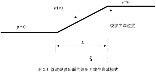 更為簡(jiǎn)便的是圖2-5所示的氣體壓力衰減模式是線性衰減函數(shù),圖中以裂紋擴(kuò)展方向z為橫軸,壓力分布p為縱軸,其計(jì)算表達(dá)式為
