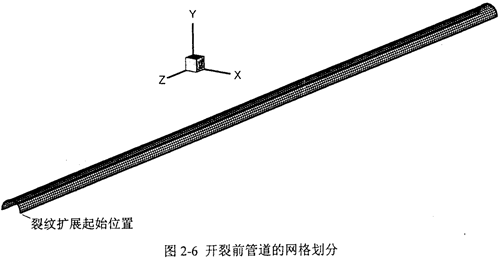 管道上的裂紋一般從起裂點(diǎn)同時(shí)向兩側(cè)擴(kuò)展。因管道幾何形狀和載荷分布具有對(duì)稱性,本文取一側(cè)管道的一半來分析和計(jì)算,即四分之一模型,如圖2-6所示。采用四節(jié)點(diǎn)板殼單元,沿管道軸向和環(huán)向分別劃分網(wǎng)格,在管道內(nèi)壁給出氣體壓力分布。