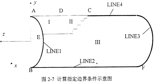 在圖2-7中,C點(diǎn)表示裂尖位置:裂紋沿LINE4擴(kuò)展,在A、B點(diǎn)和邊界LINEl、LINE2、LINE3和LINE4上施加不同的邊界條件。I、Ⅱ和Ⅲ區(qū)代表卸載區(qū)、減壓區(qū)和裂前區(qū):其中,點(diǎn)A、B和邊界LINEl、LINE2、LINE3是約束邊界條件,C點(diǎn)和邊界LINE4為運(yùn)動(dòng)邊界條件。I、Ⅱ及Ⅲ區(qū)隨時(shí)間而變化。