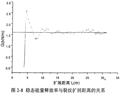 如圖2-8,隨著裂紋起裂后的迅速擴(kuò)展,裂紋驅(qū)動(dòng)力上升直至達(dá)到并保持在穩(wěn)定的數(shù)值,這一平臺(tái)值1.6KN/m就是裂紋穩(wěn)態(tài)(steady state)擴(kuò)展的驅(qū)動(dòng)力G。裂紋尖端的移動(dòng)過程中,G在該值附近有一些小的波動(dòng),這是由于裂紋長(zhǎng)度的突然增加和位移約束的突然解除,引起的有限元解的高頻振蕩。振蕩的幅度與有限元單元網(wǎng)格的疏密和單元內(nèi)節(jié)點(diǎn)力釋放的指定規(guī)律有關(guān)。