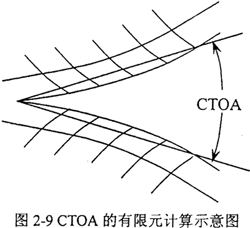 圖2-9表示了CTOA的計(jì)算方法。由于在裂紋后方有很大的非線性變形,計(jì)算中張開位移用割線近似,采用8個(gè)單元的長(zhǎng)度來計(jì)算CTOA。這一長(zhǎng)度經(jīng)過與細(xì)化后的網(wǎng)格結(jié)果比較,誤差在10%之內(nèi)。
