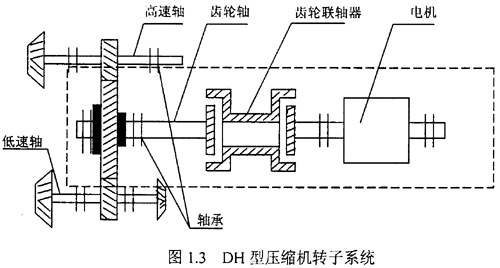 本課題來(lái)源于某工程應(yīng)用研究“雙軸型透平壓縮機(jī)軸承轉(zhuǎn)子系統(tǒng)動(dòng)力學(xué)分析”。圖1.3 是DH 型壓縮機(jī)轉(zhuǎn)子系統(tǒng)。在G 軸與電機(jī)軸之間采用齒輪聯(lián)軸器聯(lián)接。本文主要對(duì)圖1.3 虛線(xiàn)部分,G 軸、電機(jī)軸、齒輪聯(lián)軸器轉(zhuǎn)子系統(tǒng)進(jìn)行討論