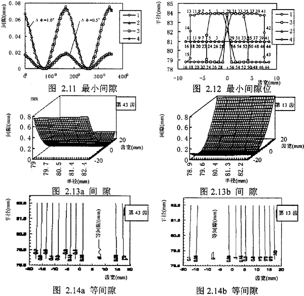 不失一般性設(shè)內(nèi)齒輪為主動(dòng)輪外齒輪相對內(nèi)齒輪徑向位移Δx=-0.2mm,Δy=0.無載荷的情況下計(jì)算結(jié)果:圖2.7是內(nèi)齒旋轉(zhuǎn)一周時(shí)任意一對齒的最小間隙的變化或在任意的轉(zhuǎn)角0下各齒對的最小間隙。2.8 圖是半徑方向最小間隙所在的位置,由于外齒是鼓形齒且沒有偏角,在無載荷的情況下只在齒輪的中央齒廓處嚙合所以僅畫出半徑方向最小間隙位置。圖2.7 曲線1 是用本章方法計(jì)算的結(jié)果,曲線2 是用Heinz 幾何方法計(jì)算的結(jié)果,我們可以看出用兩種方法計(jì)算最小間隙的大小非常一致,但位置不同圖2.8 ,因?yàn)镠einz 方法僅規(guī)定內(nèi)外齒在分度圓上嚙合,本文是從全齒高嚙合狀態(tài)來考慮最小間隙及其位置的。圖2.7中250° 近間隙為零,即在無載荷或輕載荷時(shí)內(nèi)外齒輪在此處附近的對齒嚙合,相應(yīng)圖2.8 在250°嚙合處的縱坐標(biāo)大致為基圓的半徑,即嚙合線與基圓相切并與△x 位移線平行,這與前面所說與零齒差齒輪嚙合相似;圖2.9, 2.10 是在θ=0時(shí)第39 齒(圖a)和第13齒(圖b)的齒面間隙和等間隙曲線,從圖中可以看出最小間隙在齒寬的中央,這是因內(nèi)外齒沒有發(fā)生相對轉(zhuǎn)角位移,而且間隙沿齒高方向間隙變化的梯度小,即分度圓上的間隙與齒高方向的間隙相關(guān)很小,而沿著齒輪軸向的間隙變化的梯度較大,等間隙曲線沿軸向分布呈帶狀,這也是Heinz和本文計(jì)算最小間隙大小相近的原因。