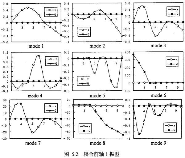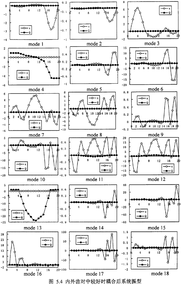 但是,另外我們可以發(fā)現(xiàn),在表5.3中出現(xiàn)了許多表5.1和表5.2中所沒有的新的固有頻率如λ4co,λ7co,λ8co,λ11co,λ12co,λ13co,觀察這些因有頻率所對應(yīng)的振型,可以發(fā)現(xiàn),它們對應(yīng)又可分為三種,1.純的彎曲耦合振型λ7co,λ8co對應(yīng)振型圖5.4中mode7、8;2.純的扭轉(zhuǎn)耦合振型λ4co,λ13co對應(yīng)振型圖5.4中mode4、13;3.彎扭振型相迭加的復(fù)振型——彎扭耦合振型λ11co,λ12co對應(yīng)振型圖5.4中mode11、12。這種彎耦合振型是由于齒輪聯(lián)軸器的耦合作用而新產(chǎn)生的,這是齒輪軸系統(tǒng)區(qū)別于一般單轉(zhuǎn)子系統(tǒng)的重要特征之一,由于彎扭耦合模態(tài)的產(chǎn)生,決定了軸系統(tǒng)的振動是彎扭耦合振動。