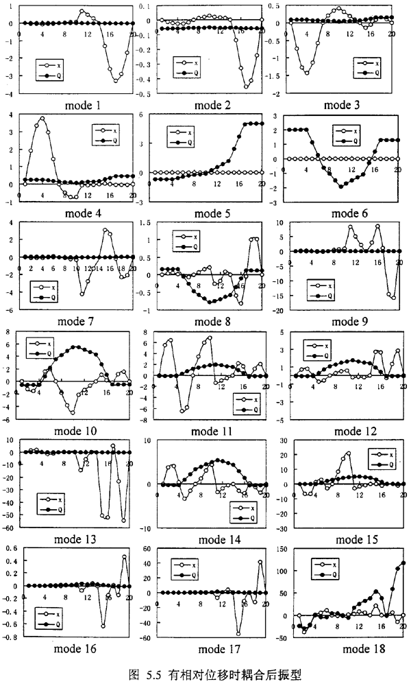 表5.3是耦合系統(tǒng)在同樣的轉(zhuǎn)速下,前18階的固有頻率,圖5.4是這些固有頻率對應(yīng)的耦合狀態(tài)下轉(zhuǎn)子的振型;橫坐標(biāo)質(zhì)點(diǎn)1~10代表軸1、11~20代表軸2;縱坐標(biāo)為振型;實(shí)點(diǎn)表示扭轉(zhuǎn)振型、空心點(diǎn)表示彎曲振型。