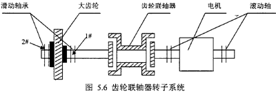 圖5.6是國產(chǎn)DH型透平壓縮機結(jié)構(gòu)簡圖1-2中,齒輪軸(簡稱G軸)、電機、齒輪聯(lián)軸器、軸承組成的轉(zhuǎn)子系統(tǒng)。這是我們主要研究對象。
