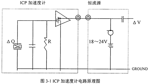 典型的集成壓電式(ICP)加速度計是在傳統(tǒng)的壓電加速度計基礎上耦合一個以場效應管為核心的內裝放大器電路所構成。電路原理如圖3-1所示。