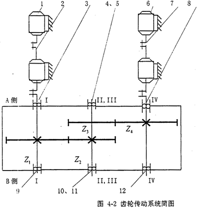 軋機減速機是軋鋼廠的動力傳輸裝置,它起到減速(粗軋時)和增速(精軋時)的作用。它一般由兩對斜齒輪、若干個調心滾子軸承和箱體組成。圖4-2是減速機機組的機構運動簡圖,在該圖中,軸III在軸II的正下方。