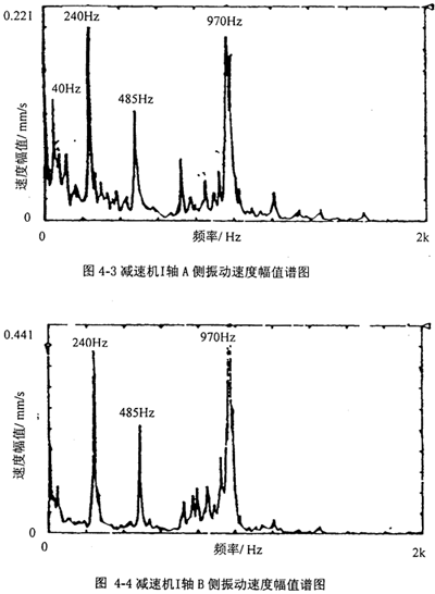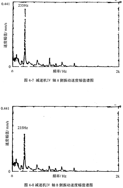 圖4-3、4-4分別是把振動加速度計放在減速機I軸A側和B側軸承座上所測得振動速度幅值譜圖;圖4-5、4-6分別是把振動加速度計放在減速機II軸A側和III軸B側軸承座上所測得振動速度幅值譜圖;圖4-7、4-8分別是把振動加速度計放在減速機IV軸A側和B側軸承座上所測得振動速度幅值譜圖。