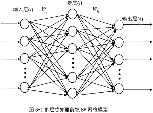 BP算法即是誤差反傳訓練算法,它是一種有導師的訓練算法,它在給定輸出目標的情況下,按其實際輸出與目標值之差的平方和為目標函數(shù),通過調(diào)節(jié)權(quán)值使目標函數(shù)達到最小值。多層感知器前饋BP網(wǎng)絡(luò)模型如圖6-1所示。