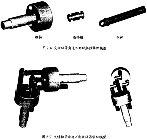 利用圖2-5中的機(jī)構(gòu)形式,將其在空間中進(jìn)行擴(kuò)展,即可得到一種非常有價(jià)值的等角速萬向聯(lián)軸器——RCRCR交錯(cuò)軸等角速萬向聯(lián)軸器。在圖2-6示意了此種聯(lián)軸器的組成零件模型,在圖2-7中示意了此種聯(lián)軸器的裝配模型,其中左右兩圖分別是從不同的視角得到的視圖。這種聯(lián)軸器在功能上能實(shí)現(xiàn)空間交錯(cuò)軸傳動(dòng),它的主要特點(diǎn)是:低副結(jié)構(gòu),耐磨損性好;構(gòu)件形狀簡(jiǎn)單,便于制造;允許被聯(lián)接的兩交錯(cuò)軸的偏移角變動(dòng)范圍大,甚至可作直角交錯(cuò)傳動(dòng)(不考慮構(gòu)件間干涉時(shí))。