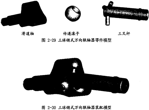 三球銷式萬向聯(lián)軸器是一種被廣泛應(yīng)用的聯(lián)軸器,已有近30年的歷史,它同后面敘述的兩種聯(lián)軸器同屬三叉式萬向聯(lián)軸器,它們的傳動(dòng)原理在本文的第三章中有詳細(xì)的描述,是一種運(yùn)動(dòng)規(guī)律十分復(fù)雜的聯(lián)軸器。它的裝配模型和零部件模型分別如圖2-30、圖2-29所示.在聯(lián)軸器轉(zhuǎn)動(dòng)時(shí),傳遞滾子既可相對滑道軸中的滑道軸向移動(dòng),也可沿三叉桿的軸頸轉(zhuǎn)動(dòng)和徑向移動(dòng),以補(bǔ)償兩軸夾角的變化。