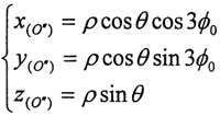 ≈0,cosθ≈1(實(shí)際上p<<L,近似處理是合理的),則可得到三小桿的球面中心P在固定坐標(biāo)系O′X′Y′Z′中的運(yùn)動(dòng)軌跡: