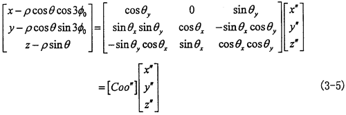 由于動(dòng)坐標(biāo)系O″X″Y″Z″的O″Y″軸取得始終垂直于固定坐標(biāo)系OX軸,可認(rèn)為先把OXYZ坐標(biāo)系繞OX軸轉(zhuǎn)過(guò)夾角θx,使OY軸與O″Y″軸平行,再繞新的OY軸轉(zhuǎn)過(guò)θy,使OX軸與O″X″軸平行,OZ軸也同時(shí)平行于O″Z″軸(變換空間位置如圖3-6所示)。則固定坐標(biāo)OXYZ與動(dòng)坐標(biāo)系間的變換關(guān)系如下: