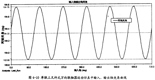 由圖4-10可以知道,輸入軸同輸出軸的夾角在三叉桿式萬向聯(lián)軸器運轉時是不斷變化的,在每一個回轉周期中,它的變化頻率為3次,這證明了這種聯(lián)軸器是一種非定心式萬向聯(lián)軸器,同時在一定的程度上驗證了三叉桿式三軸頸的交點以三倍于萬向聯(lián)軸器的轉速作圓周運動的理論的正確性。另外還可看出盡管夾角在不斷變化,但變化非常小,對兩軸的夾角大小影響很小,本次仿真中夾角大小平均是164.32°(其補角為15.7°,即是第三章中理論計算中的角度之一)。