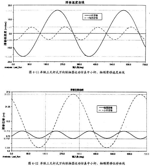 由圖4-12可以知道,在一定的夾角下,小桿在滑道中的滑移位移同小桿球面中心相對軸頸的滑移位移是不同的,前者(20.76mm)要遠大于后者(2.93mm),且它們變動的頻率也不一樣,在一個回轉周期中,前者步率是1次,而后者2次。此圖中的兩曲線同第三章中的理論分析曲線圖3-9、圖3-10是吻合的。這在一定的程度上也證明了三叉桿式萬向聯(lián)軸器理論分析中對小桿滑移位移和軸頸滑移位移這兩項計算的正確性。