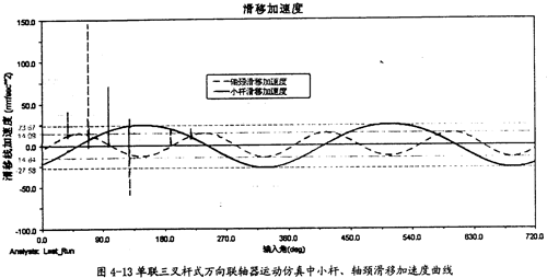 由圖4-13可以知道,在一定的夾角下,小桿在滑道中有滑移加速度同小桿球面中心相對軸頸的滑移加速度是不同的,前者要大于后者,且它們變動的頻率也不一樣,在一個回轉周期中,前頻率是1次,而后者2次。此圖中的兩曲線同第三章中的理論分析曲線圖3-13、圖3-14是吻合的,只是小桿滑移的加速度曲線在外形上有差異,仿真的曲線相當的平滑、規(guī)則,但理論分析曲線卻不規(guī)則,這可能是在計算中簡化和省略的原因。盡管如下,這在一定的程度上也證明了三叉桿式萬向聯(lián)軸器理論分析中對小桿滑移加速度和軸頸滑移加速度這兩項計算的正確性。(值得說明的是此圖中曲線有時有突變的現象,主要是考慮到計算機的性能,計算中步長稍大的原故。在后面的分析曲線中也出現了這樣的情況,將不再作說明。)