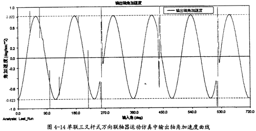 由圖4-9可以知道,當輸入軸轉速恒定為90o/s時,輸出軸并不作恒速轉動,而是以90o/s為中心,作非常有規(guī)律的周期性運動,在每一個回轉周期中,它的變化頻率為3次。這里的結果同第三章中的曲線圖3-8也是完全吻合的,因此在一定的程度上也證明了三叉桿萬向聯(lián)軸器轉速分析理論的正確性。