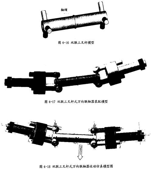 在本次分析中,建立的裝配模型是在第三章中圖3-2所示的模型的基礎上除去關節(jié)軸承,將三叉桿用圖4-16所示的雙聯(lián)三叉桿替換,在此模型的右端再加上同左端相同的結構,就得到雙聯(lián)三叉桿式萬向聯(lián)軸器的裝配模型。此模型如圖4-17所示。