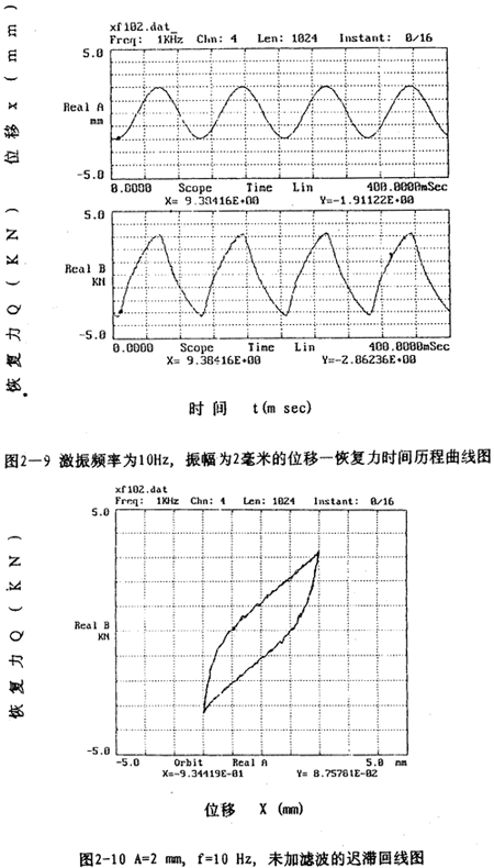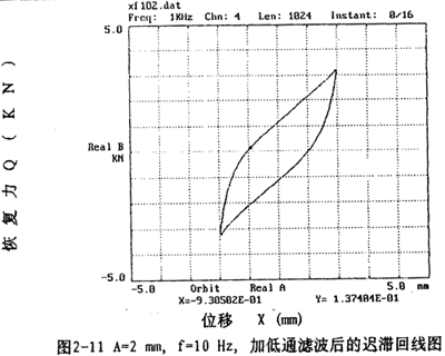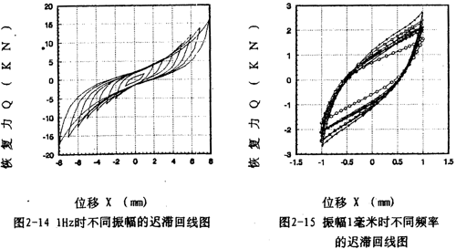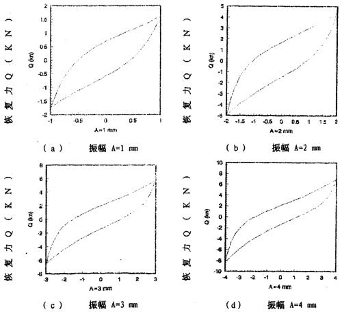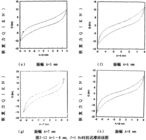 圖2-9(見26頁)表示激振頻率為1OHz,振動位移幅值為±2毫米的位移和恢復力時間歷程圖,圖2-10(見26頁)、圖2-11(見27頁)為對應的遲滯回線圖。圖2-l2(見27、28頁)表示激振頻率為IHz,振動位移幅值分別為±(1-8)毫米的位移一恢復力圖,圖2-14(見29頁)則為圖2-12的合圖,由圖2-14同頻率不同振幅的八條遲滯回線分析可知,大撓度剛絲繩彈性聯(lián)軸器的動剛度與振動幅值有關,同時,從遲滯回線面積(表示聯(lián)軸器阻尼所耗散的能量)可知聯(lián)軸器的阻尼與振動幅值也有關,即聯(lián)軸器的動剛度和阻尼均是振幅的非線性函數(shù)。