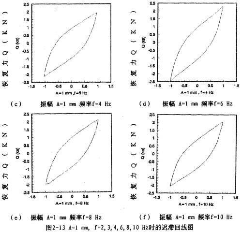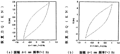 圖2-13(見28、29頁)表示振幅為l毫米,激振頻率分別為2,3,4,6,8,10Hz的遲滯回線圖,圖2-15(見29頁)表示振幅為1毫米,激振頻率為1,2,3,4,6,8,10,20,30Hz的遲滯回線合圖。由圖2-15可知,彈性聯(lián)軸器的動剛度與振動頻率有關,即隨著頻率增大,對應的遲滯回線的恢復力與位移的比值變小,當頻率在8Hz至30Hz范圍內(nèi)時,遲滯回線基本重合,由此可知鋼絲繩聯(lián)軸器動剛度在一定頻率范圍內(nèi)與頻率有關、當頻率增大到8Hz以后,聯(lián)軸器的動剛度不再隨頻率變化而變化,因而聯(lián)軸器的動剛度在一定頻率范圍內(nèi)與頻率有關,當頻率增大到8Hz以后,聯(lián)軸器的動剛度不再隨頻率變化而變化,因而聯(lián)軸器的動剛度在一定頻率范圍內(nèi)是頻率的非線性函數(shù),當頻率增大到一定值后,動剛度與頻率無關,同樣,聯(lián)軸器的阻尼在一定頻率范圍內(nèi)的頻率的非線性函數(shù),當頻率增大到一定值后(這里是8Hz),阻尼與頻率無關。
