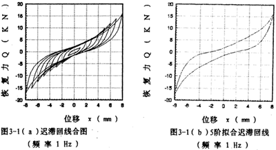 2,將擬合得到的各冪函數(shù)多項式奇、偶次項分開寫成(3-5)式形式并作對應(yīng)的曲線圖,如圖3-2(見34頁)所示,這樣就將恢復(fù)力分解成了單值非線性函數(shù)曲線和雙值的非線性函數(shù)閉合曲線,由此得到了對應(yīng)的