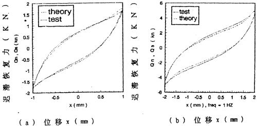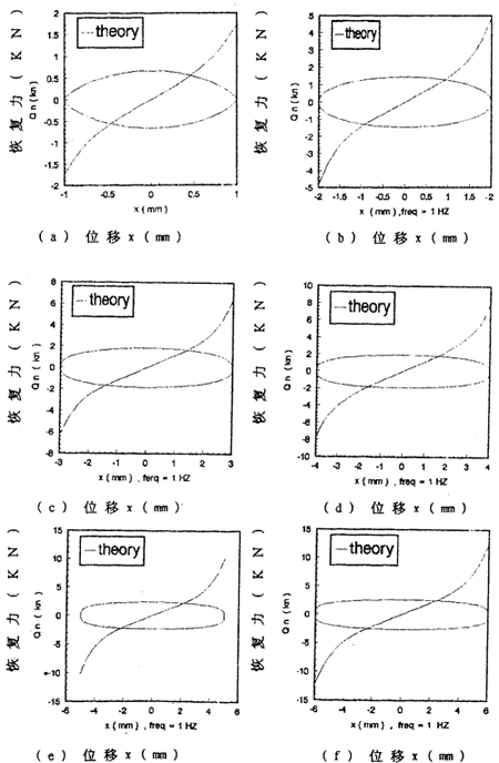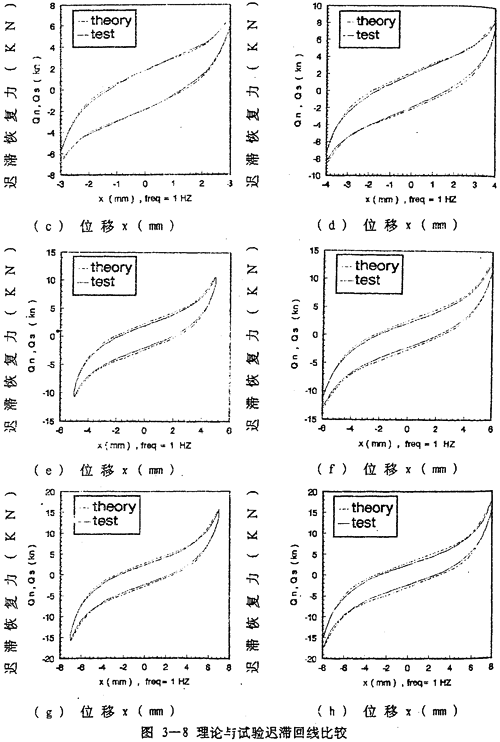 由數(shù)學模型(3-47) 計算可以得到不同激勵頻率和振幅下聯(lián)軸器恢復力遲滯回線數(shù)據(jù),為了證實(3-47)的正確性,下面畫出頻率為1赫茲、振幅為1~8毫米各工況下數(shù)學模型計算的理論數(shù)據(jù)和試驗數(shù)據(jù)表示的遲滯回線圖,如圖(3-8)(a)~(h)(見51~52頁)所示,圖中虛線為理論回線,實線為試驗遲滯回線。從圖中可知,理論遲滯回線十分接近試驗遲滯回線,由此可以說明建立的聯(lián)軸器數(shù)學模型(3-47)式可較好地描述恢復力隨振幅A頻率f、瞬時位移x和速度變化的規(guī)律,較圓滿地解決了聯(lián)軸器恢復力建模與參數(shù)函數(shù)辨識的難題。