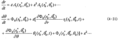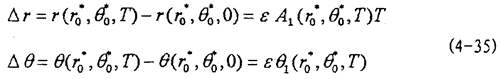 這就是對(duì)應(yīng)于(4-2)式的頻閃差分方程,即(4-2)式在Poicare平面上以T為周期的點(diǎn)變換方程。如ε充分小,則可令△τ=dτ,△r=dr,△θ=dθ,此外,(4-36)中的
