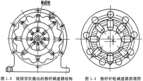推桿減速器雖然和其它活齒傳動機(jī)構(gòu)在原理上基本相同,但由于采用獨(dú)特的推桿作為活齒構(gòu)件,所以機(jī)構(gòu)本身有它的特殊性。并且經(jīng)歷了若干次結(jié)構(gòu)上的更新,才發(fā)展成為目前這種已形成工業(yè)生產(chǎn)能力的結(jié)構(gòu)形式。