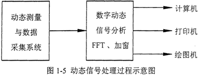 信號(hào)是動(dòng)態(tài)測(cè)量和動(dòng)態(tài)分析的對(duì)象。動(dòng)態(tài)測(cè)量和動(dòng)態(tài)分析的過(guò)程,實(shí)質(zhì)上就是信號(hào)采集、轉(zhuǎn)換、存貯和處理的過(guò)程,廣義上屬于信息論的范疇。動(dòng)態(tài)信號(hào)處理過(guò)程示意圖如圖1-5所示。