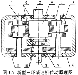 三環(huán)減速機(jī)是在綜合分析現(xiàn)行通用減速技術(shù)基礎(chǔ)上開(kāi)發(fā)的一種新型傳動(dòng)機(jī)械,屬于少齒差行星齒輪傳動(dòng)的范疇。該減速機(jī)既不同于平行軸定軸傳動(dòng),又不同于同軸傳動(dòng),可以稱為平行軸動(dòng)軸傳動(dòng)。