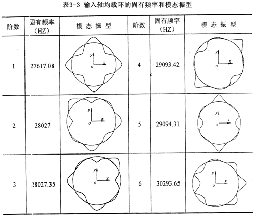 本文利用I-DEAS軟件來進(jìn)行彈性均載環(huán)的動力學(xué)分析。首先求解均載環(huán)的固有特性問題,在圖3-14所示的均載環(huán)的力學(xué)模型中,均載環(huán)的邊界條件取為均載環(huán)的八個外凸臺固支,輸出軸均載環(huán)和輸入軸均載環(huán)的有限元模型參數(shù)同3.5.3,中研究的一致。應(yīng)用Model草藥Solution模塊中的Model response部分,選用Normal Mode Dynalnics-SVI(普通模態(tài)動力分析——同步矢量迭代法)方法求得輸出軸均載環(huán)和輸入軸均載環(huán)的前六階固有頻率和模態(tài)振型分別如表3-2、3-3所示。