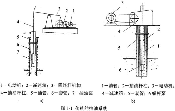 傳統(tǒng)的采油設(shè)備主要以游梁式抽油機(圖1-la)為主,其由三部分組成:一是地面部分-游梁式抽油機,包括電動機、減速箱和四連桿機構(gòu);二是井下部分-抽油泵,它懸掛在套管中油管的下端;三是聯(lián)系地面和井下的中間部分-抽油桿柱,它由一種或幾種直徑的抽油桿和接箍組成。游梁式抽油機的優(yōu)點是結(jié)構(gòu)簡單、制造容易、維護方便,缺點是抽油泵排量太小,一般為50~100米3/天。而且該系統(tǒng)含砂敏感,地面驅(qū)動部分體積龐大。為了減輕抽油機的重量,人們又開發(fā)了無游梁式抽油機,它分為機械無游梁式抽油機和液壓無游梁式抽油機兩種。它們的共同特點是保留抽油桿和原來的抽油泵,維持有桿泵抽油設(shè)備的工作方式。無游梁式抽油機,特別是液壓無游梁式抽油機的采用,可以降低抽油桿中的應(yīng)力和改善它的工作條件,因而擴大了有桿泵抽油設(shè)備的使用范圍。然而,無論是游梁式抽油機還是無游梁式抽油機,由于其抽油泵固有的結(jié)構(gòu)特點,在抽取含砂、含氣、含水、含蠟、含膠質(zhì)、含石膏的原油、稠油和低滲透層原油時,均無法滿足工作要求。