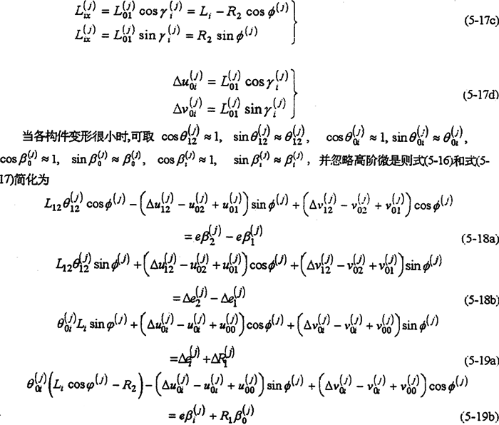三環(huán)減速是多相并列連桿行星齒輪傳動(dòng)過(guò)約束機(jī)構(gòu)。應(yīng)該從整體系統(tǒng)上去考慮其變形關(guān)系。圖5-3是一相子機(jī)構(gòu)的位移關(guān)系圖。圖5-3(a)是基本位置圖、圖5-3(b)是高速軸之間的位移關(guān)系、圖5-3(c)是高速軸與輸出軸之間的位移關(guān)系(i=1、2)。由圖寫(xiě)出各運(yùn)動(dòng)副中心的位移關(guān)系如下: