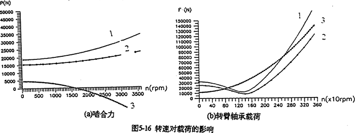 輸入扭矩對減速器的靜態(tài)載荷產(chǎn)生影響,而轉(zhuǎn)速是對動態(tài)載荷產(chǎn)生影響。圖5-16是輸入轉(zhuǎn)速對減速器的載荷影響情況。轉(zhuǎn)速越大,三相嚙合力越不均衡,當轉(zhuǎn)速超過1500rpm后,第三相齒板與外齒輪的嚙合力變成負值。負向嚙合力將阻礙輸出軸的轉(zhuǎn)動,使內(nèi)嚙合副產(chǎn)生干涉。第一片齒板的嚙合力最大,幅值隨轉(zhuǎn)速的增加而增加。從行星軸承載荷看,轉(zhuǎn)速小于1600rpm時載荷較均衡,大于1600rpm后,隨轉(zhuǎn)速加大,其幅值變大。