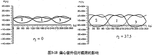 圖5-18是偏心套外徑對嚙合圖的影響。當不考慮偏心套外徑(r2=0)時,嚙合力分布為正值?紤]偏心套外徑(r2=37.5mm)計算結(jié)果,出現(xiàn)負向嚙合力。而且其幅值明顯增大。輸入扭矩也不再是固定值。因此,對三環(huán)減速器進行動力計算,必須考慮r2的影響。此外,行星軸承內(nèi)外圈接觸承載位置,也影響三環(huán)減速器的動力性能。