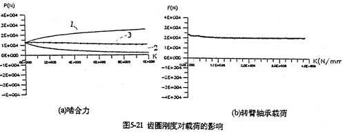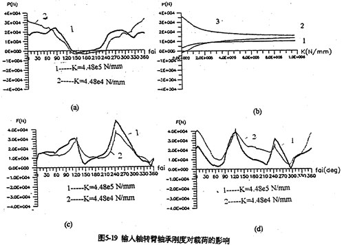 只考慮行星軸承變形及齒板變形時,影響三環(huán)減速器載荷特性的剛度,主要是行星軸承剛度、和內(nèi)齒圈的變形剛度。軸承剛度與軸承材料、間隙、油膜等很多因素有關。圖5-19是輸入軸行星軸承剛度對嚙合力及行星軸承載荷的影響。當輸入行星軸承剛度小一個數(shù)量級時,負向嚙合力區(qū)域增大(見圖5-19a);隨剛度減小、各相嚙合力越不均恒(圖5-19b),輸入軸行星軸承剛度的影響比輸入軸行星軸承剛度更大,見圖5-20所示。嚙合力及各行星軸承載荷在軸承剛度較小的情況時,都出現(xiàn)正常載荷的10倍以上的沖擊現(xiàn)象,沖擊產(chǎn)生的位置隨剛度變化不同。內(nèi)齒圈剛度對載荷的影響與行星軸承剛度相反(見圖5-21所錄)。當剛度越小時,三相齒板的嚙合力越均恒(見圖5-21a),而且行星軸承載荷幅值基本上不變(見圖5-21b)。同此可推知,減小三環(huán)減速器振動的途徑之一就是提高行星軸承剛度,減小內(nèi)齒圈剛度。這可以通過對行星軸承進行預緊,和采用軟齒面或大柔度齒圈的辦法,以使嚙合力和行星軸承載荷均衡化,以達到減振降噪的目的。