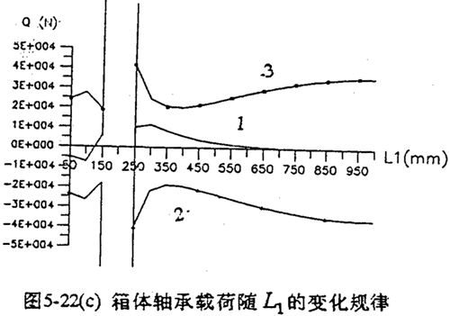 當|L1-L2|≤50mm時,載荷產(chǎn)生沖擊為無窮大,L1≥400mm以后,隨著L1的增加,三相行星軸承載荷幅值變化很緩慢,接近于直線分布。但箱體軸承載荷的幅值在L1>350mm后,隨L1增加各相之間的幅值差變大,趨于不均衡狀態(tài)(見圖5-22c)。因此SHQ50型及SHQ63型的三環(huán)減速器的振動比SHQ40型的大。