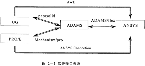 以上四個(gè)軟件均是當(dāng)今比較流行且功能強(qiáng)大的大型CAD/CAE軟件,然而考慮到ADAMS的內(nèi)核就是Parasolid,從UG中導(dǎo)入ADAMS的模型包含了在UG里定義的密度、質(zhì)量等幾何屬性,不需作任何變更就可使用;而PRO/E與ADAMS間通過(guò)Mechanism/pro模塊進(jìn)行連接時(shí)存在較多的問(wèn)題,經(jīng)過(guò)長(zhǎng)時(shí)間的摸索才連通,且發(fā)現(xiàn)在PRO/E里南非先將各個(gè)零件定義為剛體,作為子裝配只能定義為一個(gè)剛體,可是像RV減速器這樣的大模型在裝配過(guò)程中不可避免地含有子裝配并且子裝配中的零件間有相對(duì)運(yùn)動(dòng),將其定義為一個(gè)剛體是錯(cuò)誤的,為此,本課題中采用了UG、ADAMS與ANSYS形成的分析平臺(tái)。